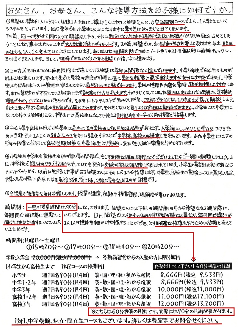 1対1の完全個別指導と同様、【パターン授業法】により限られた時間で最大限の学習効果を目指します。